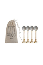 Unit price per5"L Stainless Steel & Brass Coffee Spoons w/ Gold Finish Bow Handles, Set of 4 in Printed Drawstring Bag