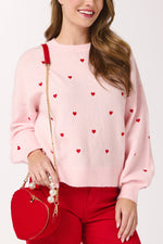 Unit price perFall in love with your wardrobe all over again in our Hearts Sweater. This cozy pullover features a soft pink base sprinkled with tiny red embroidered hearts that add the perfect dose of sweetness. With a relaxed fit and classic crewneck, it’s made for everything from Galentine’s brunches to snuggly nights in. Pair it with your favorite jeans or red pants for a festive pop!
