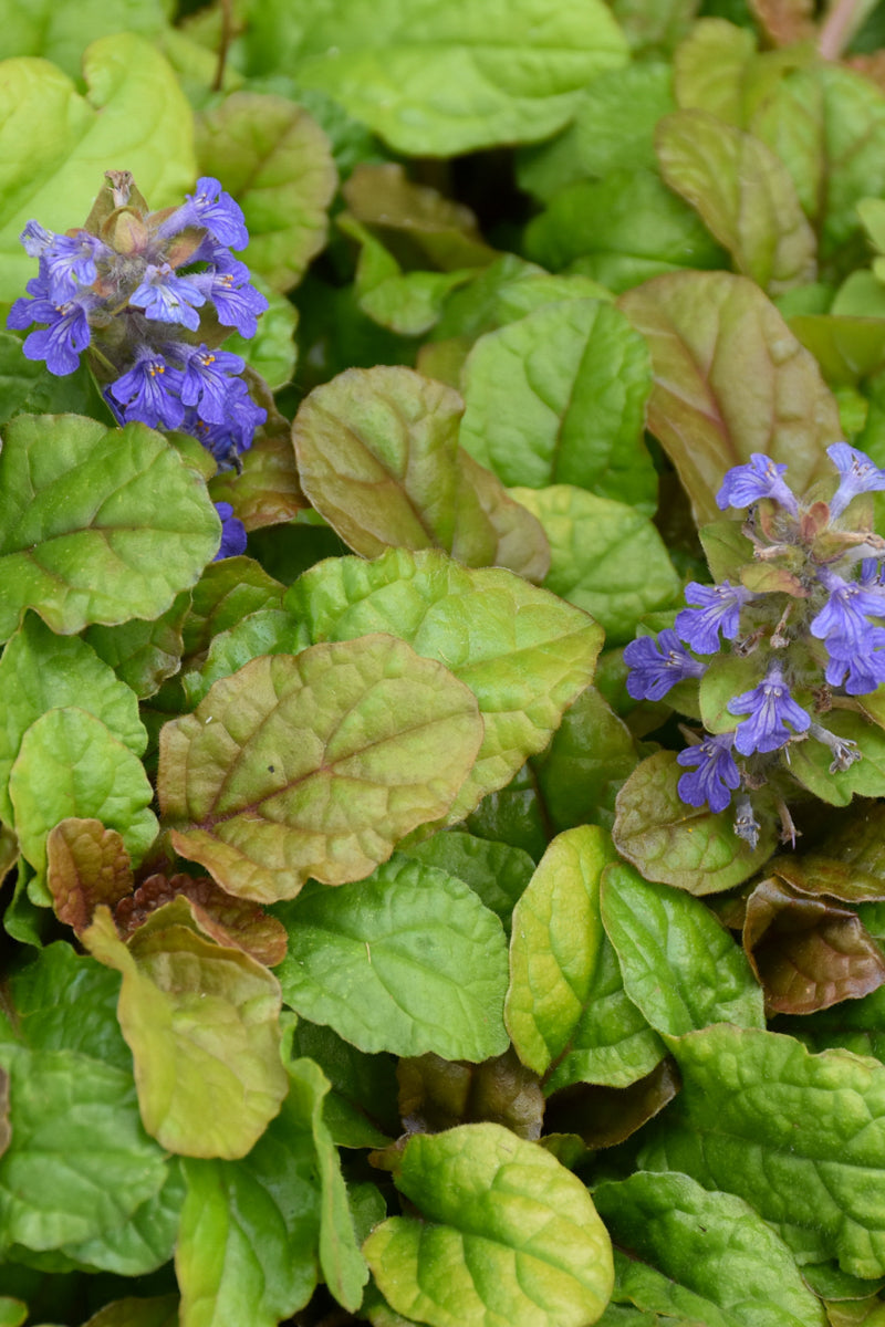A stunning variety, featuring tri-color foliage of yellow, orange, and red, topped with contrasting violet-blue flowers; excellent when used in containers, as a groundcover, or in border fronts; tolerates any soil with good drainage.