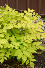 Sun King Aralia or Japanese Spikenard features airy racemes of white star-shaped flowers at the ends of the stems from mid to late summer. Its large serrated pointy compound leaves emerge lemon yellow in spring, turning gold in color throughout the season. It produces deep purple berries from early to late fall.