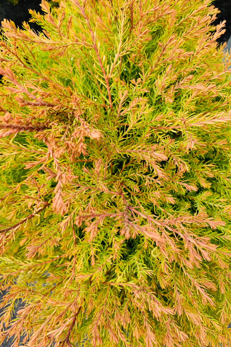 Fire Chief is an almost perfectly globe-shaped evergreen shrub with fine-textured, bright gold spring foliage that becomes flushed deep red in fall. This sport of the popular Rheingold has deeper color and is less prone to splitting. Slow growing, and needs no pruning to maintain its round shape. Perfect for grouping in the home foundation or featured as a rock garden specimen. Best given some protection from winter wind. May need protection from deer. The species itself is native to eastern North America, including Illinois, and is commonly used as an ornamental plant.