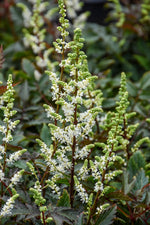 Happy Spirit Astilbe has masses of beautiful plumes of white flowers at the ends of the stems from late spring to early summer, which are most effective when planted in groupings. The flowers are excellent for cutting. Its ferny compound leaves remain dark green in color throughout the season. The dark red stems can be quite attractive.