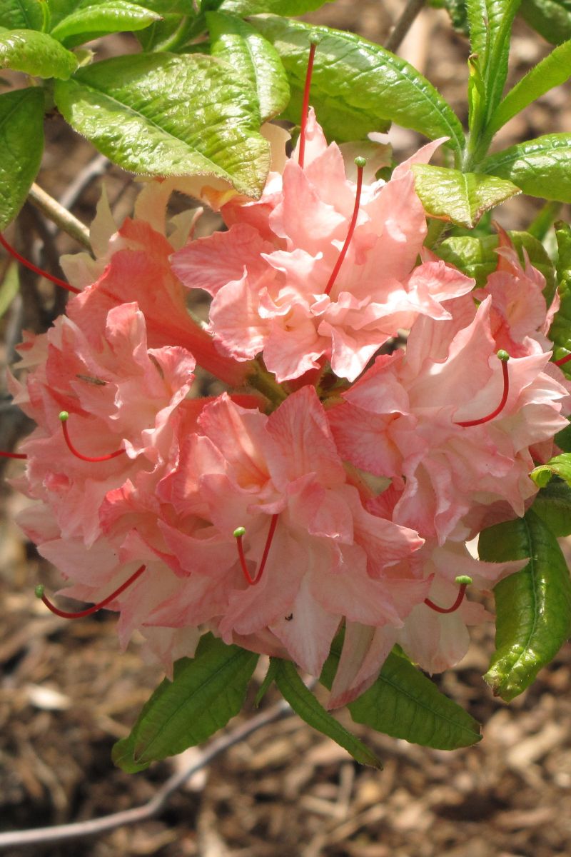 Cannon's Double Azalea is covered in stunning clusters of lightly-scented double white trumpet-shaped flowers with yellow throats and rose edges at the ends of the branches in mid spring, which emerge from distinctive red flower buds before the leaves. It has burgundy-tipped dark green foliage. The glossy narrow leaves do not develop any appreciable fall color.