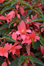 Bossa Nova® Pink Glow Begonia features dainty nodding pink bell-shaped flowers with scarlet overtones at the ends of the stems from mid spring to mid fall. Its attractive serrated narrow leaves remain green in color throughout the year. The dark red stems can be quite attractive.