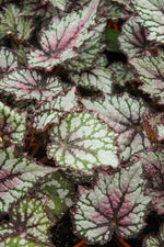 Jurassic Green Streak Begonia's attractive large twisted heart-shaped leaves remain silver in color with distinctive dark green veins and tinges of rose throughout the year on a plant with an upright spreading habit of growth.