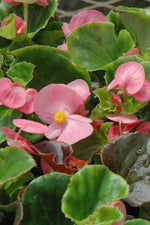 Super Olympia Pink Begonia features dainty pink orchid-like flowers with yellow throats at the ends of the stems from mid spring to mid fall. Its succulent heart-shaped leaves remain dark green in color with hints of coppery-bronze throughout the year.