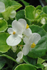 Super Olympia White Begonia features dainty white orchid-like flowers with yellow throats at the ends of the stems from mid spring to mid fall. Its succulent heart-shaped leaves remain dark green in color throughout the year.