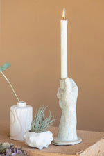 Unit price perThis striking and engaging stoneware hand taper candle holder has a cream-colored reactive glaze finish with tiny dark flecks throughout. It is a conversation-starting accent for the home decor that will look great on a coffee table, mantel, or side table. Display on a stack of books, boxes or as a stand-alone decor piece. Holds a standard taper candle.