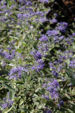 Arthur Simmonds Caryopteris features dainty cymes of powder blue flowers along the branches from mid summer to early fall. The flowers are excellent for cutting. It has grayish green foliage with silver undersides. The fuzzy oval leaves do not develop any appreciable fall color.