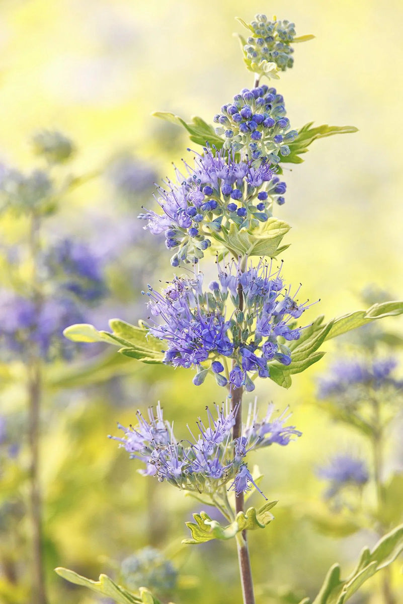 La Barbe Bleue™ Caryopteris features dainty cymes of royal blue flowers along the branches from late summer to mid fall. The flowers are excellent for cutting. It has attractive yellow foliage with hints of light green. The fragrant narrow leaves are highly ornamental but do not develop any appreciable fall color. The brick red stems can be quite attractive.