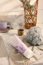 A soothing, floral body scrub infused with hydration boosting sodium hyaluronate and argan shell powder that gently exfoliates to reveal soft, renewed skin while argan oil soothes and moisturizes.