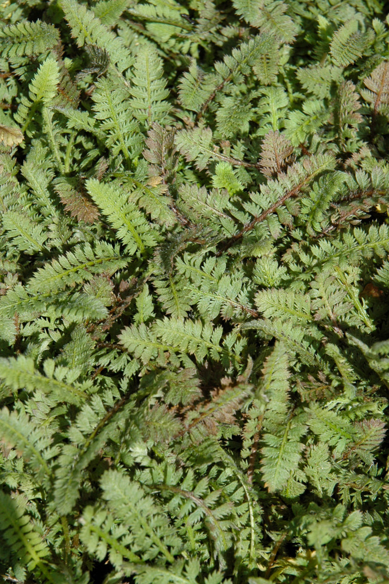 Brass Buttons's attractive tiny ferny compound leaves are grayish green in color on a plant with a spreading habit of growth. The foliage often turns coppery-bronze in fall. It features subtle chartreuse flowers held atop the stems from mid to late spring.