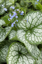Brilliant silver leaves with contrasting green veins are distinctive and eye-catching in shaded beds and woodland gardens. Clusters of tiny blue flowers provide additional color in the spring. Use en masse to create a shimmering groundcover or use individually as a garden accent. An herbaceous perennial.