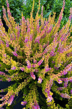 Firefly Heather features tiny spikes of violet bell-shaped flowers at the ends of the branches from mid summer to mid fall. It has attractive scarlet evergreen foliage. The needles are highly ornamental and turn orange in the fall, which persists throughout the winter.