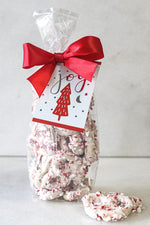 Mini 3-ring pretzels enrobed in white chocolate and decorated with peppermint crunch. Each 5-ounce bag is tied with a red ribbon.