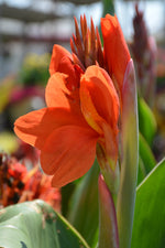 Orange Canna features bold spikes of orange flag-like flowers at the ends of the stems from late spring to mid fall. Its attractive pointy leaves remain green in color throughout the year.