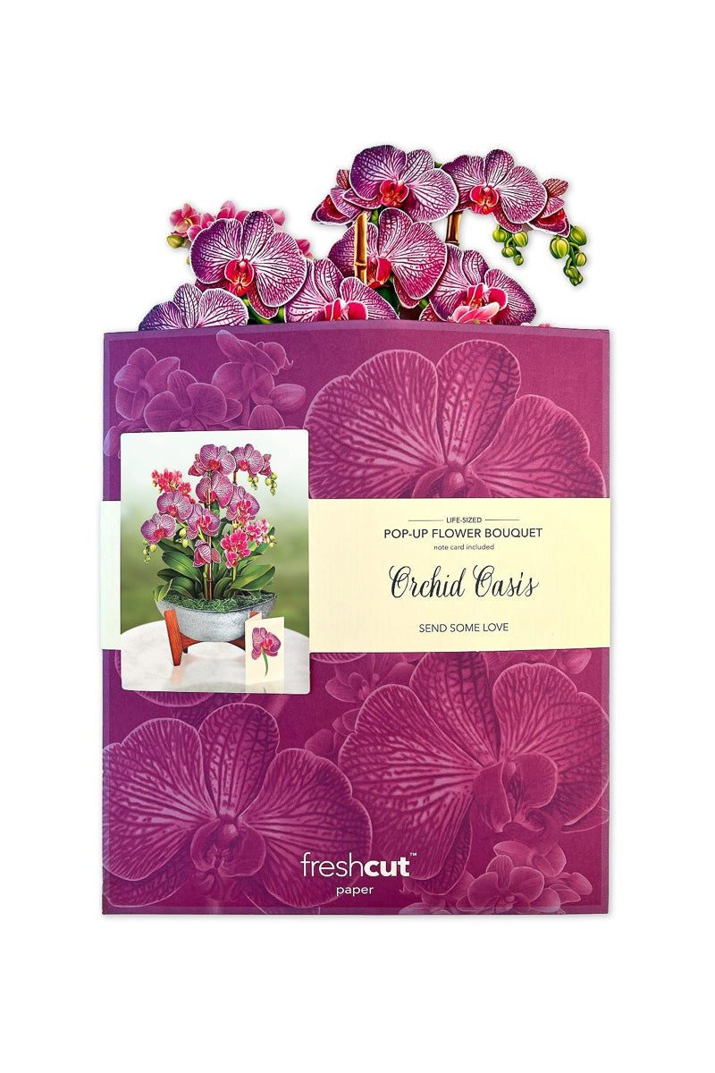 Inspired by a tropical getaway, these luxurious and striking orchid blooms embody the lush landscapes of the rainforest. Complete with a mahogany "wood" stand and modern stone planter, this house plant makes the perfect gift and chic home decor.