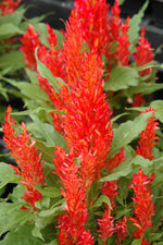 Plumed Celosia features showy plumes of scarlet flowers with orange overtones rising above the foliage from early summer to mid fall. The flowers are excellent for cutting. Its pointy leaves remain light green in color throughout the season.