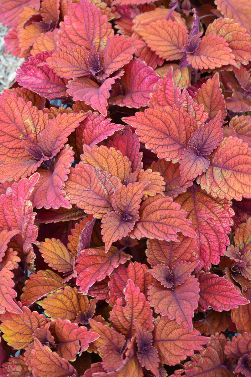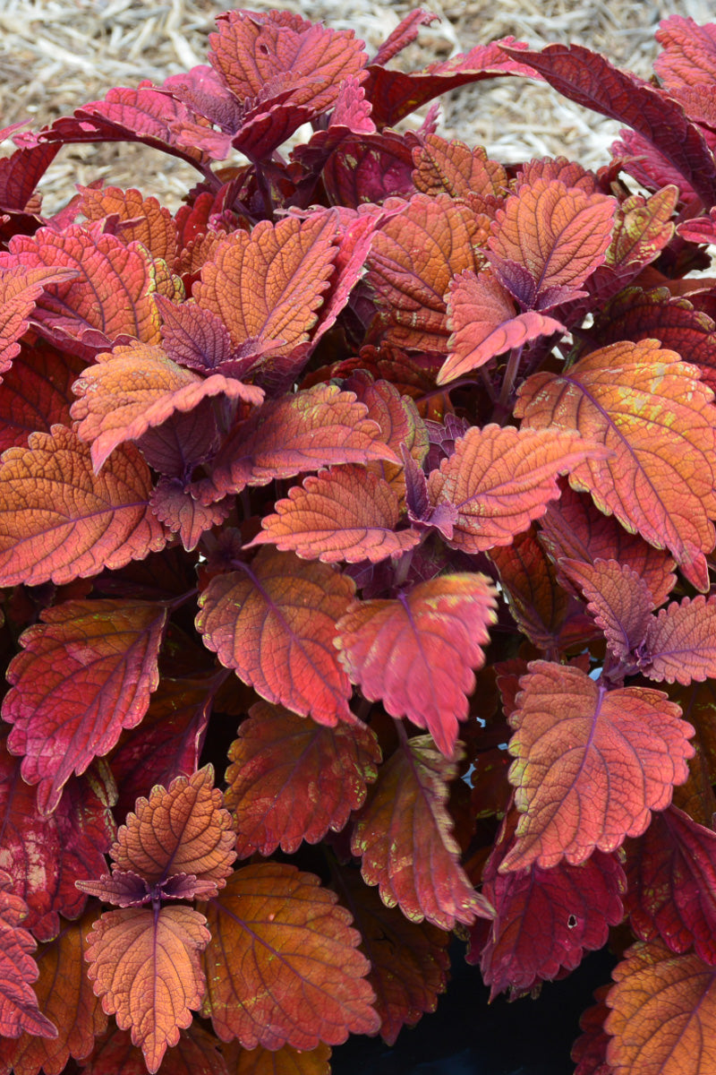 Inferno Coleus' attractive crinkled pointy leaves emerge orange in spring, turning scarlet in color with hints of coppery-bronze the rest of the year on a plant with an upright spreading habit of growth.