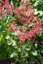 Firefly Coral Bells has masses of beautiful spikes of red bell-shaped flowers rising above the foliage from late spring to early summer, which are most effective when planted in groupings. Its attractive crinkled lobed leaves emerge chartreuse in spring, turning grayish green in color the rest of the year.