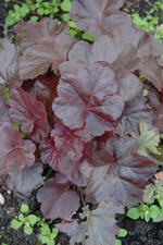 Versatile, colorful Heuchera adds dramatic color to a multitude of settings from flower beds and mixed borders to porch and patio containers. Dark purple, almost black, leaves maintain their rich color all season long. Tiny, creamy white, bell-shaped flowers rise on wiry stems above the dense mound of foliage in May and June. While Heuchera will tolerate shade, the foliage color and general vigor of the plant will not be as good. Named after Obsidian, the dark colored volcanic glass often used as a gemstone.