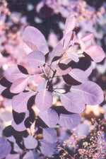 Purple Smokebush features airy plumes of red flowers with orange overtones at the ends of the branches from early to late summer. It has attractive purple-variegated grayish green foliage with hints of coppery-bronze which emerges deep purple in spring. The round leaves are highly ornamental and turn outstanding shades of brick red and orange in the fall.