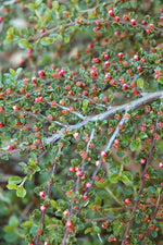 Rockspray Cotoneaster is primarily valued in the garden for its cascading habit of growth. It features tiny clusters of pink flowers along the branches in mid spring. It has dark green deciduous foliage. The tiny glossy round leaves turn an outstanding brick red in the fall.