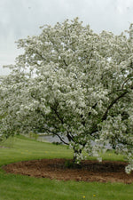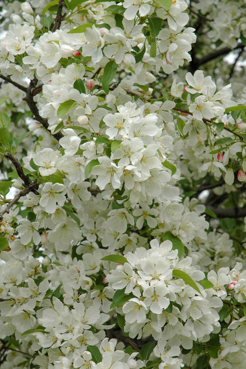 Donald Wyman Flowering Crabapple is bathed in stunning clusters of fragrant white flowers along the branches in mid spring, which emerge from distinctive cherry red flower buds before the leaves. The fruits are showy red pomes carried in abundance from early fall to late winter. It has dark green deciduous foliage. The pointy leaves turn yellow in fall.