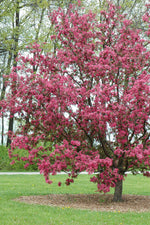 Purple Prince Flowering Crabapple is clothed in stunning clusters of fragrant pink flowers along the branches in mid spring, which emerge from distinctive rose flower buds before the leaves. It has attractive light green deciduous foliage which emerges purple in spring. The pointy leaves are highly ornamental and turn an outstanding orange in the fall. The fruits are showy burgundy pomes carried in abundance from early to late fall.