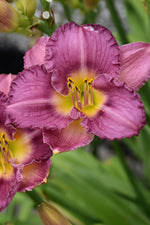 Strutter's Ball Daylily features bold purple trumpet-shaped flowers with yellow throats and a white ring at the ends of the stems in mid summer. The flowers are excellent for cutting. Its grassy leaves remain green in color throughout the season.