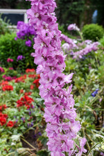 Delgenius® Chantay Larkspur features bold spikes of rose flowers with pink overtones and white centers rising above the foliage from early to late summer. The flowers are excellent for cutting. Its deeply cut lobed leaves remain dark green in color throughout the season.