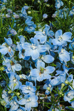 Summer Blues Delphinium has masses of beautiful panicles of sky blue flowers with white eyes at the ends of the stems from early summer to early fall, which are most effective when planted in groupings. The flowers are excellent for cutting. Its crinkled ferny compound leaves remain dark green in color throughout the season. Summer Blues is a Dwarf Delphinium.