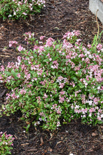 Yuki Kabuki® Deutzia is covered in stunning racemes of pink cup-shaped flowers with white overtones at the ends of the branches from mid to late spring. It has dark green deciduous foliage. The serrated pointy leaves turn outstanding shades of burgundy and purple in the fall.