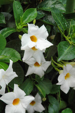 Bush White Mandevilla features bold white tubular flowers with gold throats along the stems from late spring to mid fall. Its glossy pointy leaves emerge light green in spring, turning dark green in color the rest of the year.