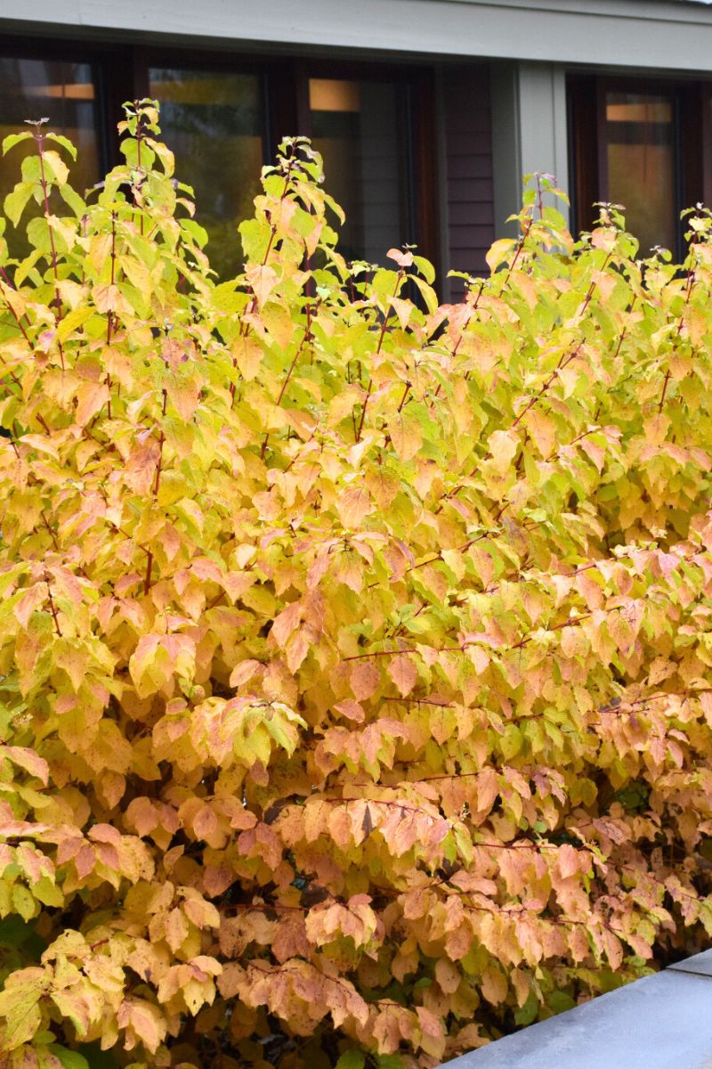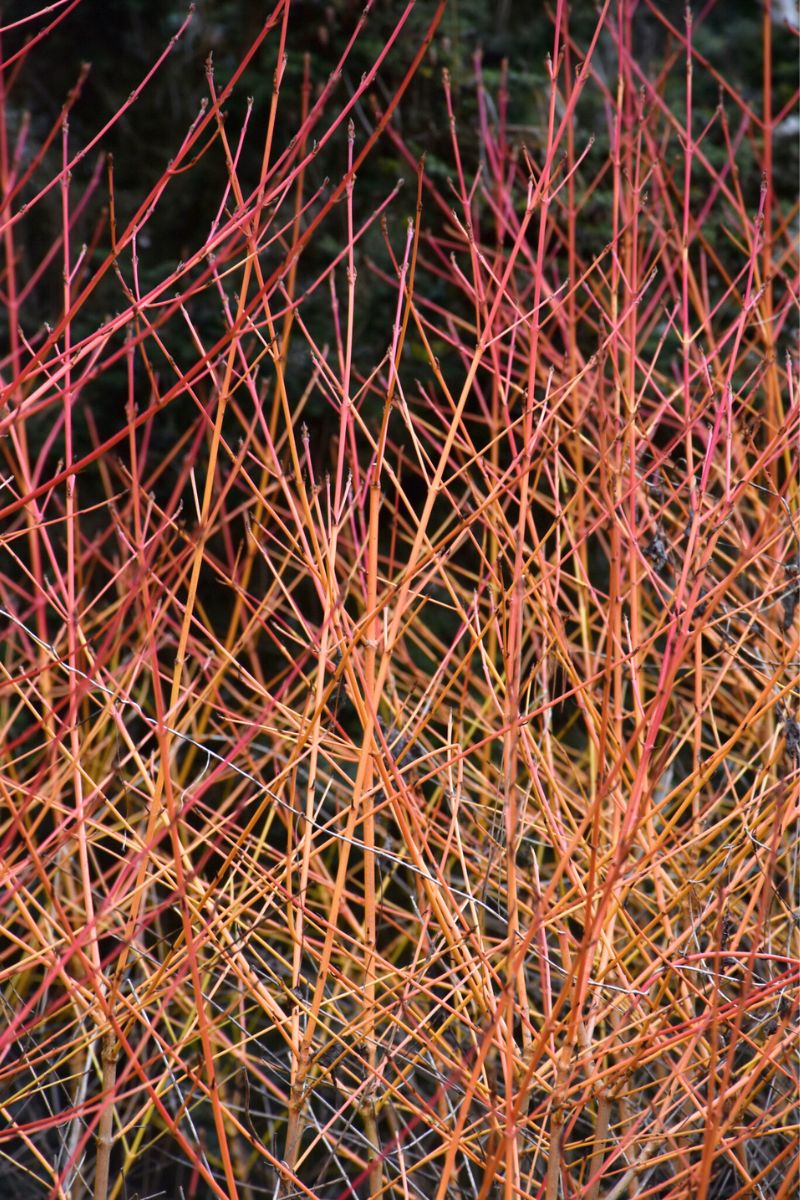 Midwinter Fire Dogwood has clusters of creamy white flowers at the ends of the branches in late spring. It has green deciduous foliage. The glossy oval leaves turn an outstanding gold in the fall. It produces deep purple berries in late summer. The red bark and harvest gold branches are extremely showy and add significant winter interest.