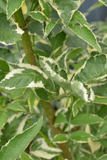 An attractive garden shrub with white edged variegated foliage, showy clusters of small, creamy white flowers in late spring, followed by black berries if a pollinator is present; dense habit and very adaptable, survives with minimal care