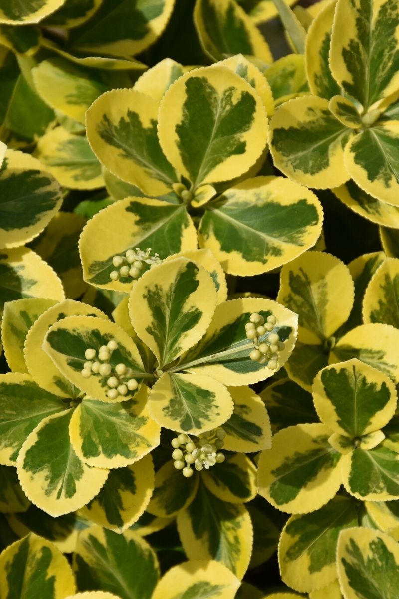 A vigorous and hardy vine or spreading shrub featuring eye-catching gold variegated evergreen leaves, showy yellow fruit and orange seeds; a versatile and adaptable color accent for almost any garden application, most dramatic foliage occurs in full sun
