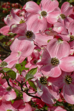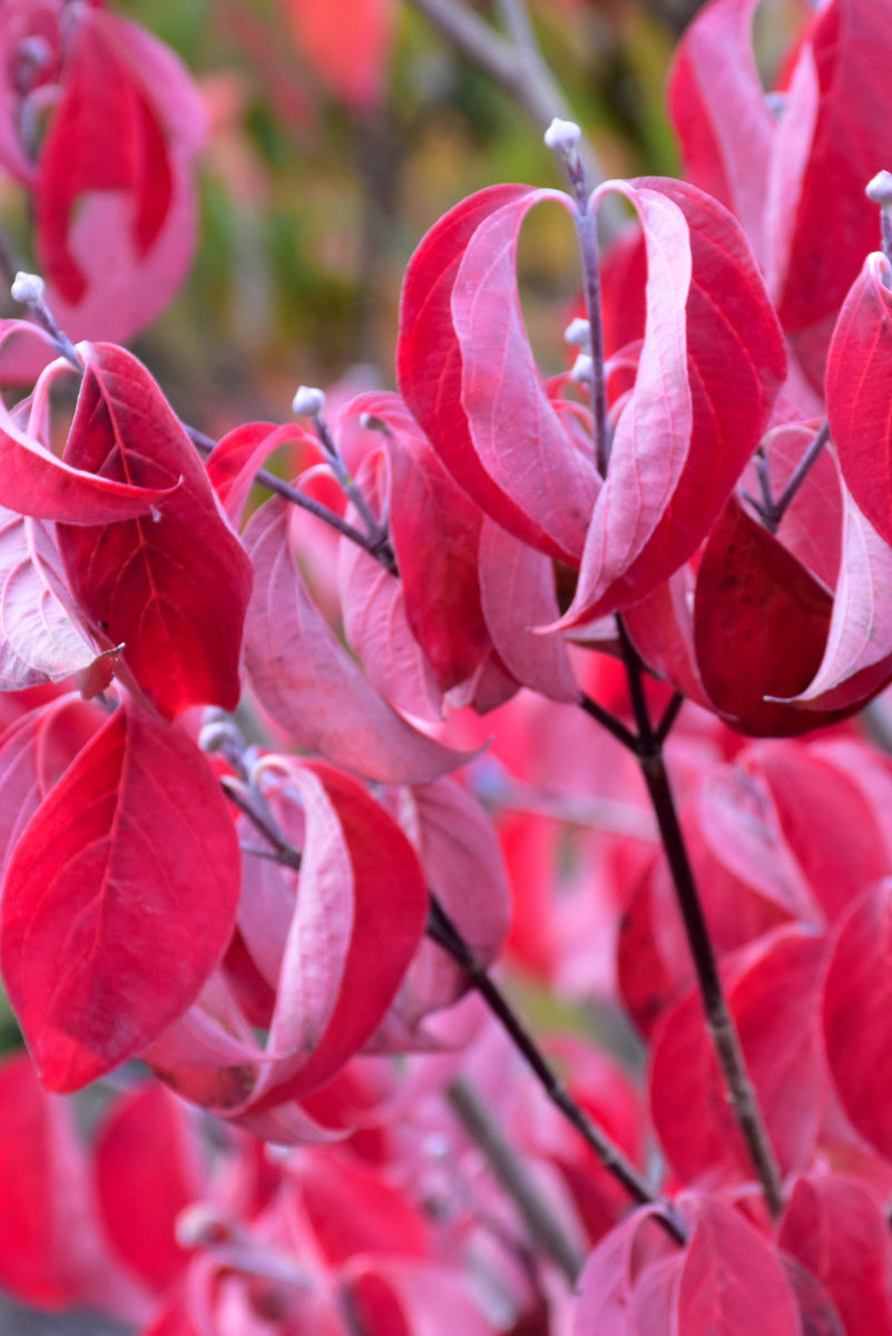Cherokee Brave Flowering Dogwood features showy clusters of crimson flowers with white centers held atop the branches in mid spring. It has forest green deciduous foliage which emerges burgundy in spring. The pointy leaves turn an outstanding brick red in the fall. It produces red berries from early to late fall. The warty gray bark adds an interesting dimension to the landscape.