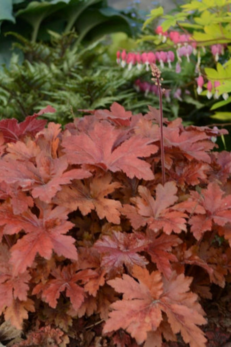 This easy perennial is grown mainly for its bronze red, lobed foliage. Leaves emerge dark red in spring and mellow to deep green in summer. Creamy, bottlebrush-like flowers.