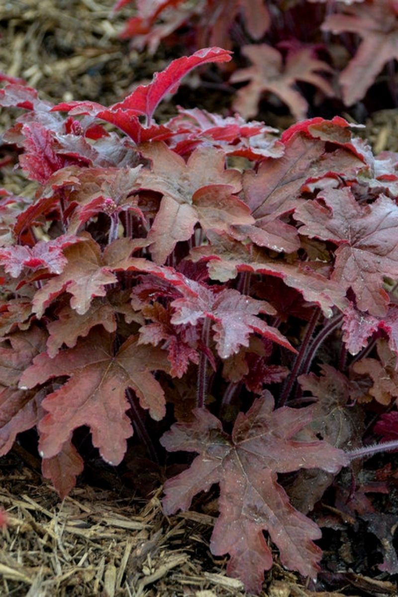 This easy perennial is grown mainly for its attractive, coppery red, heavily lobed foliage. Each finger-like leaf has a burgundy red center. Olive green summer leaf color. Creamy white, bottlebrush-like flowers.