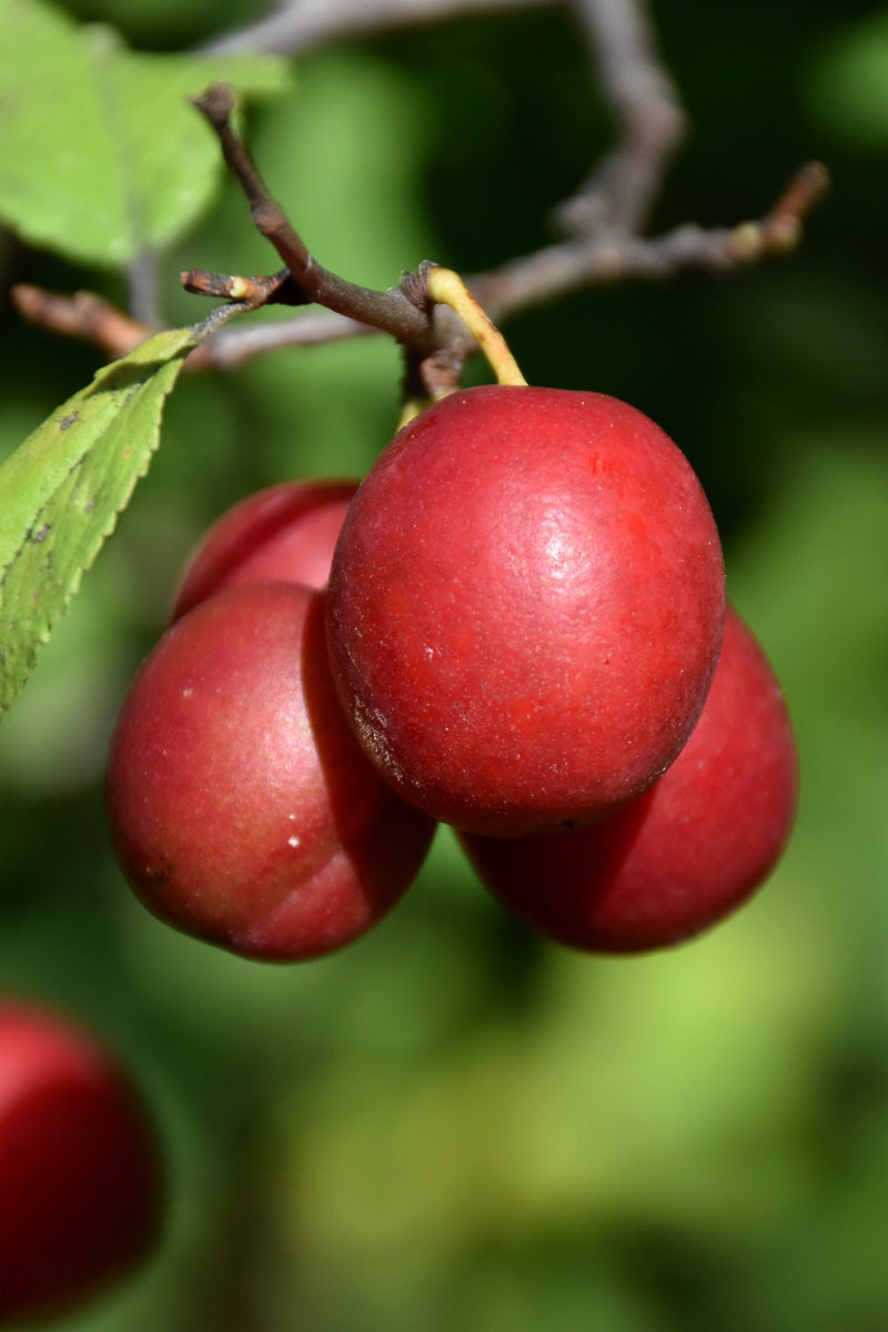 Bubblegum Plum is a small tree that is typically grown for its edible qualities. It produces crimson round fruit (technically 'drupes') with gold flesh which are usually ready for picking in late summer. Note that the fruits have hard inedible pits inside which must be removed before eating or processing. The fruits have a tangy taste with a juicy texture and a spicy fragrance.