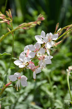Whirling Butterflies Gaura features airy spikes of white star-shaped flowers with shell pink overtones rising above the foliage from late spring to early fall, which emerge from distinctive ruby-red flower buds. The flowers are excellent for cutting. Its narrow leaves remain green in color throughout the season.