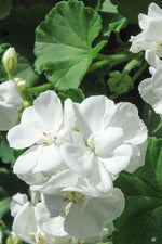 Maestro White Geranium features bold balls of lightly-scented white flowers at the ends of the stems from late spring to early fall. The flowers are excellent for cutting. Its tomentose round palmate leaves remain green in color with prominent brown stripes throughout the year.