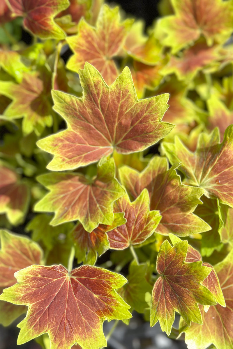 You can tell by the star-shaped flowers and pointy, lobed leaves that Pelargonium 'Vancouver Centennial' is one of the Stellar Geraniums. Mounds of two-tone bronze and gold leaves cover the compact form, while red-orange flowers appear in graceful clusters above.