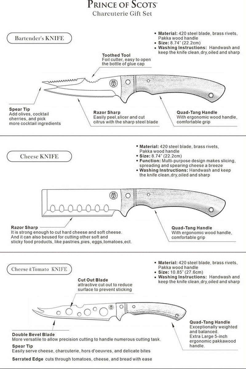 - Premium Cheese-Tomato Knife: Measures 10.85 Inches Long, 5 inch handle, 5.85 inch blade, 420 Steel Blade, Brass Rivets, and Pakkawood Handle. Beautiful and Functional featuring Prince of Scots Logo as a seal of approval.