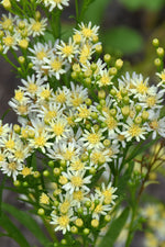 Sugar Kisses Goldenrod has masses of beautiful ray-like plumes of white flowers with yellow eyes at the ends of the stems from late summer to late fall, which are most effective when planted in groupings. Its narrow leaves remain green in color throughout the season.