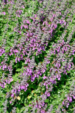 Teucrium chamaedrys, commonly known as Wall Germander, is a perennial, evergreen shrub native to Europe and the Mediterranean region. It belongs to the mint family, Lamiaceae, and typically grows up to 12-18 inches tall, forming a low, bushy mound. Wall Germander is characterized by its glossy, dark green, oval leaves and small, tubular, two-lipped, pink to purple flowers that bloom in summer. This hardy plant thrives in well-drained soil and full sun to partial shade. It is often used in knot gardens, as a low hedge, or in rock gardens for its ornamental appeal, compact growth habit, and attractive foliage.