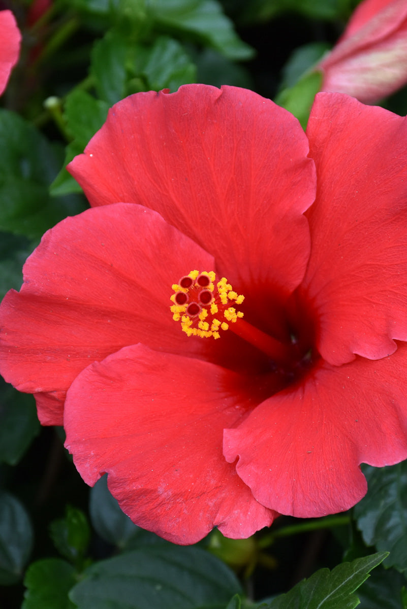 Antigua Wind Hibiscus features bold scarlet round flowers at the ends of the branches from mid summer to early fall. It has dark green evergreen foliage. The glossy pointy leaves remain dark green throughout the winter.