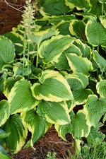 Spartacus Hosta features dainty spikes of lavender tubular flowers rising above the foliage from early to mid summer. Its attractive textured heart-shaped leaves remain bluish-green in color with distinctive yellow edges and tinges of powder blue throughout the season.