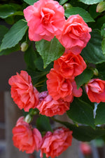 Salmon Double Impatiens features bold double salmon round flowers at the ends of the stems from mid spring to early fall. Its pointy leaves remain green in color throughout the season.